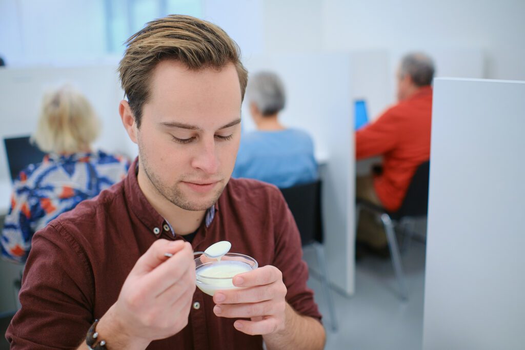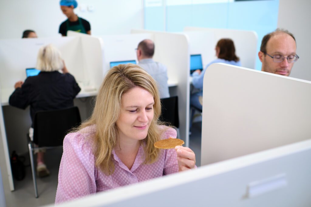 Bij aanvang wordt je in de wachtruimte verwelkomd door een van onze testleiders. Vervolgens krijg je een nummer dat verwijst naar de cabine waarin jij mag plaatsnemen. In de cabine staat een computer waar je op inlogt om toegang te krijgen voor de digitale vragenlijst. Daarna krijg je één-voor-één en na elkaar producten aangeboden om te proeven. Je beoordeelt de producten en geeft jouw mening via de digitale vragenlijst. Een smaakonderzoek duurt gemiddeld tussen de 30 en 90 minuten.